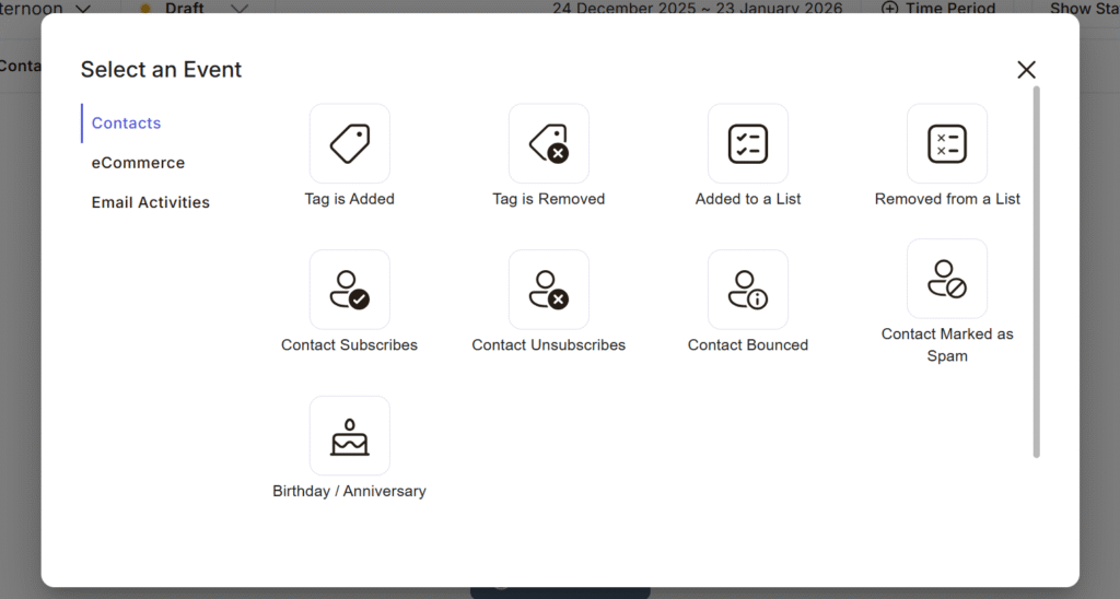 This event is triggered when a specific tag is added to a contact. Tags are labels used to identify a contact’s interest, behavior, or status. You can start a follow-up email series, Send targeted offers, Move contacts into a sales funnel.