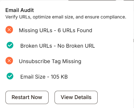 View Details opens a detailed, actionable report of the Email Audit. It shows Which elements have missing URLs, Where they are in your email, What needs to be fixed.