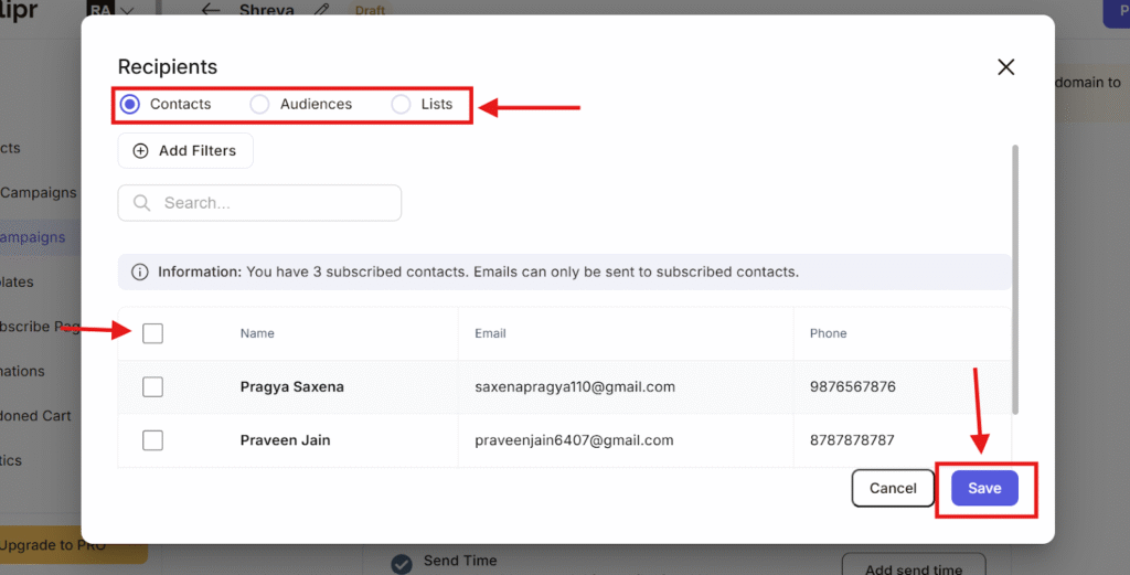 Pick the contacts / audience / List you want to send your email campaigns. Select names to whom you want to send Email and click the save button.