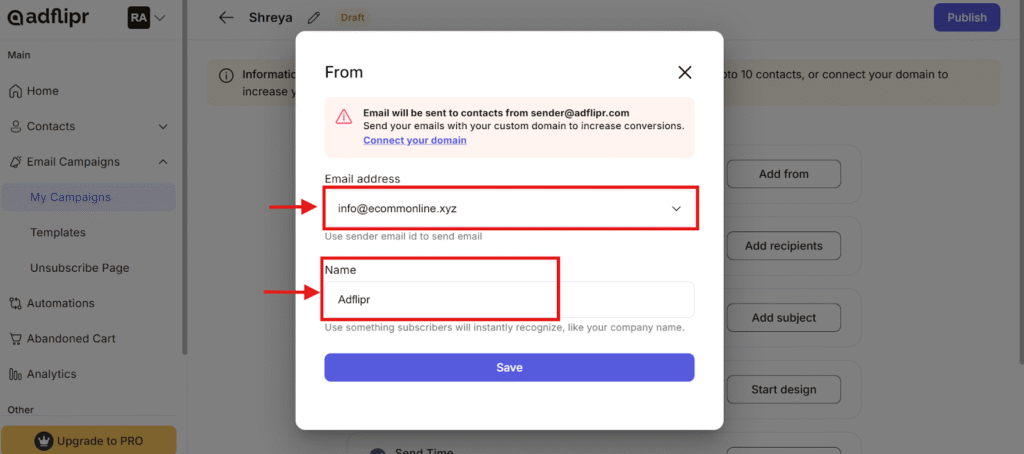 3.1 From– Add the sender name and email address you’ll use to send campaigns to your contacts. Fill the Email address correctly to avoid any mistake.