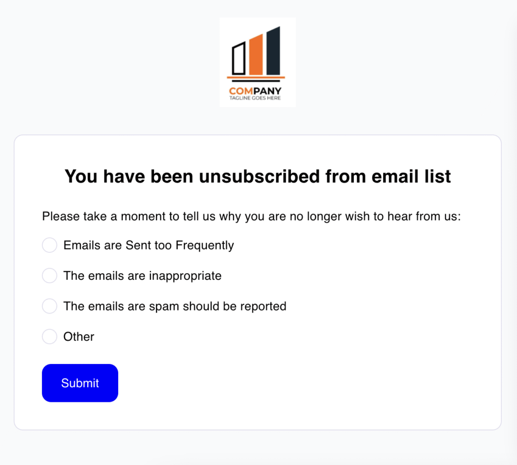 At the bottom of the page, there is a Submit button when the user clicks Submit the unsubscribe reason is saved and the feedback is recorded for analysis.