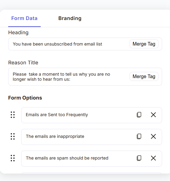 Form Options (Unsubscribe Reasons)