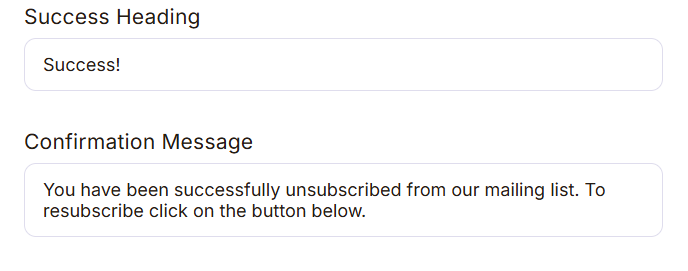 This is the main message that is shown on the top of the unsubscribe page. It clearly confirms to the user that their request was successful. Also there is a Merge Tag option that allows dynamic text like customer name or user information to be added automatically.